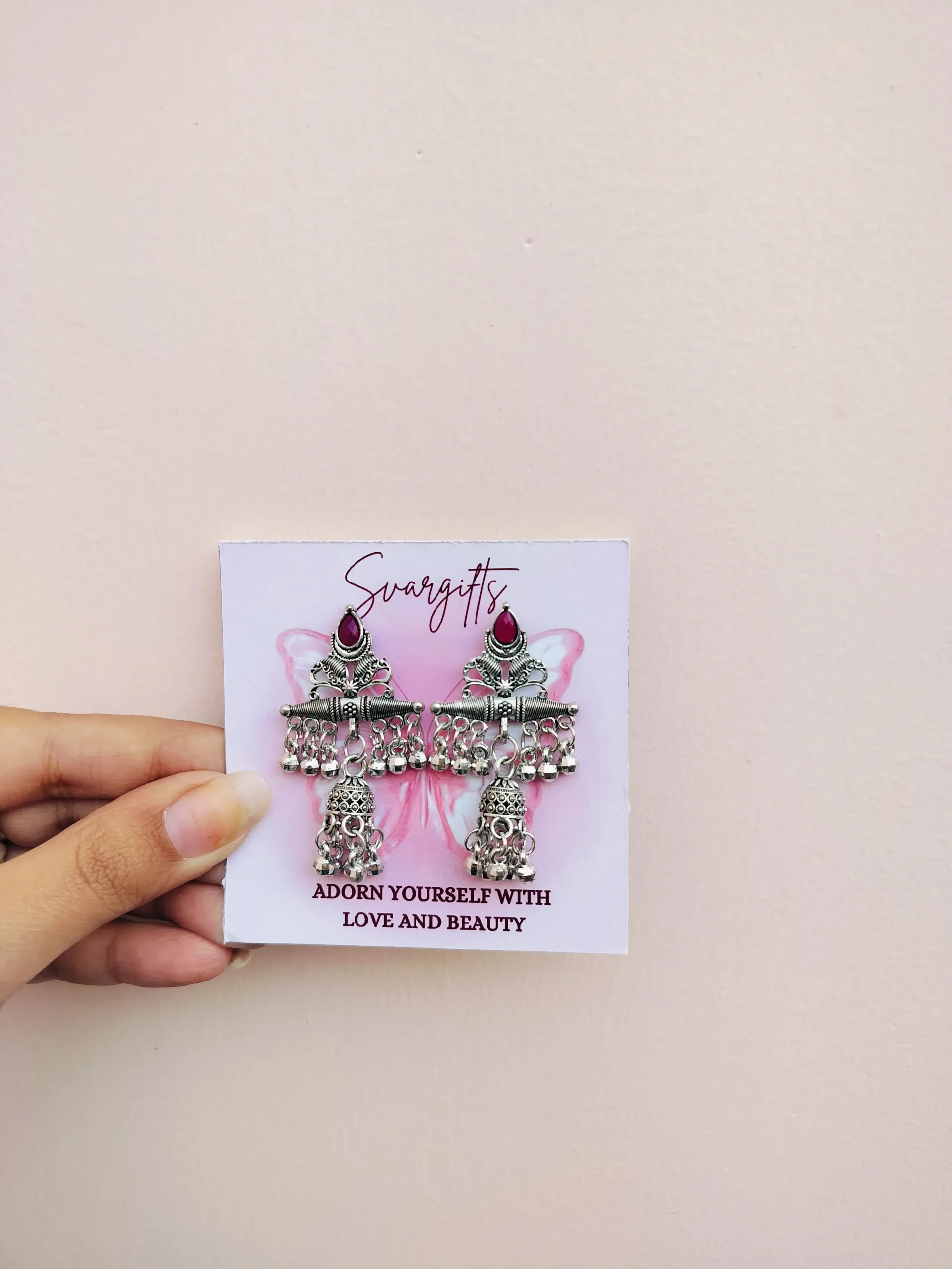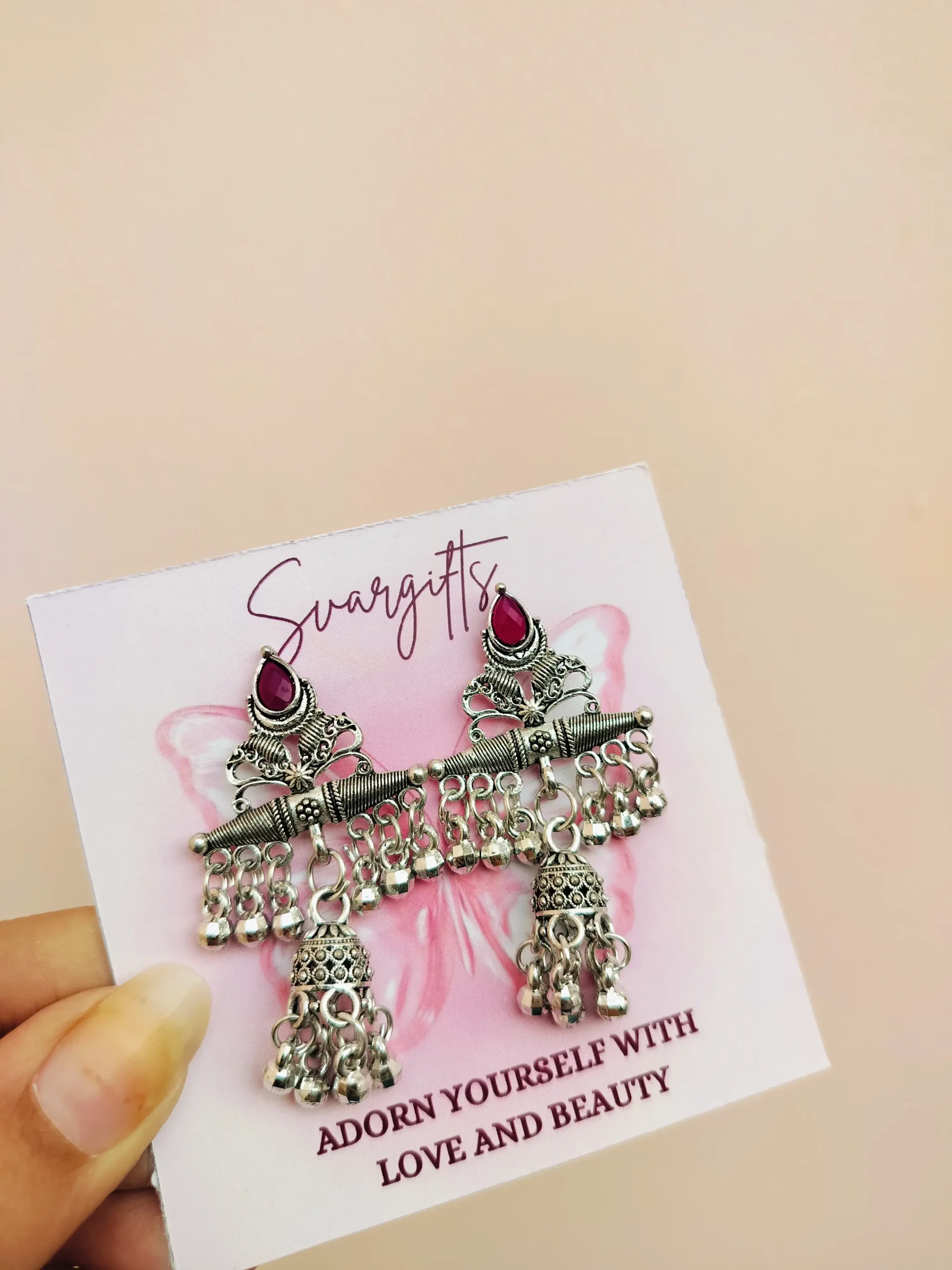 Elegant oxidised jhumka studs with a rich ruby-red stone, perfect to add a touch of ethnic charm to your everyday and festive looks.